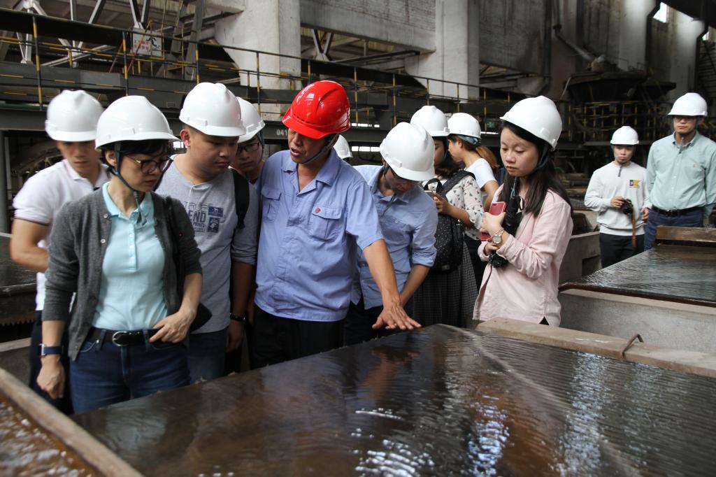 學員們先后參觀了熔煉車間精礦倉、反射爐舊址、頂吹爐主控室、精煉車間電熱連續結晶機、圓盤自動澆鑄機及錫庫,詳細了解了錫冶煉流程的設備原理、操作控制、工藝原理、入爐原料品位等方面情況。