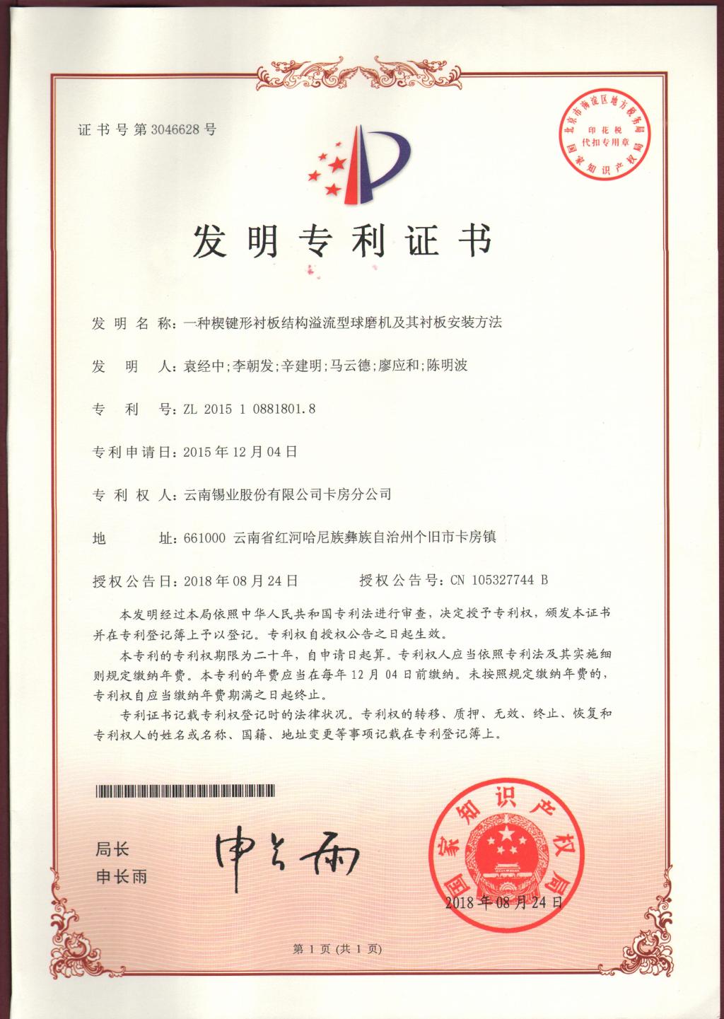 近日,卡房分公司申報的發明專利《一種楔鍵形襯板結構溢流型球磨機及其襯板安裝方法》《一種錫硫化礦粗精礦的精選選礦工藝》再獲國家知識產權局正式授權,并授予國家發明專利證書。這是今年繼8月份該分公司申報的發明專利《一種共生硫化礦中富含高砷硫精礦的降砷選礦工藝》《一種皂類捕收劑GY-10藥劑溶液的溶解配制方法》獲國家發明專利證書之后,再獲兩項發明專利授權。